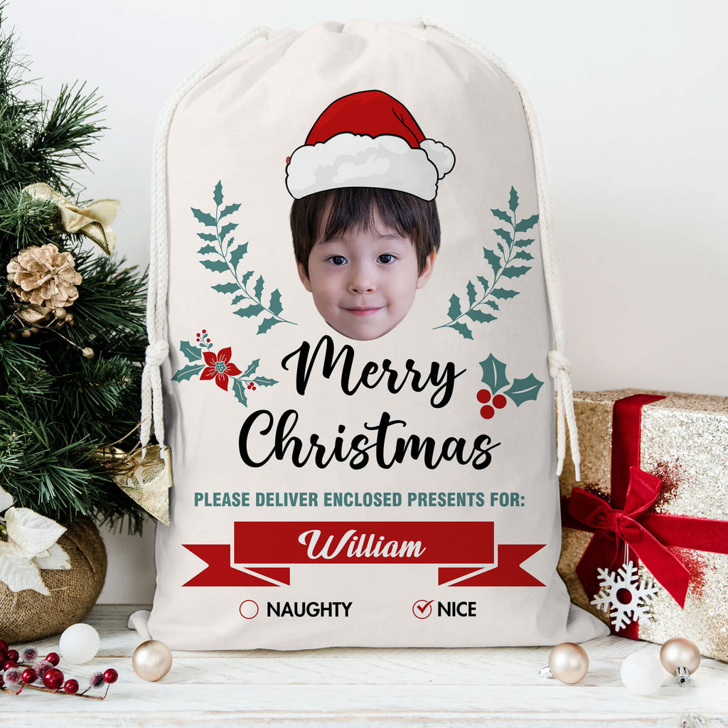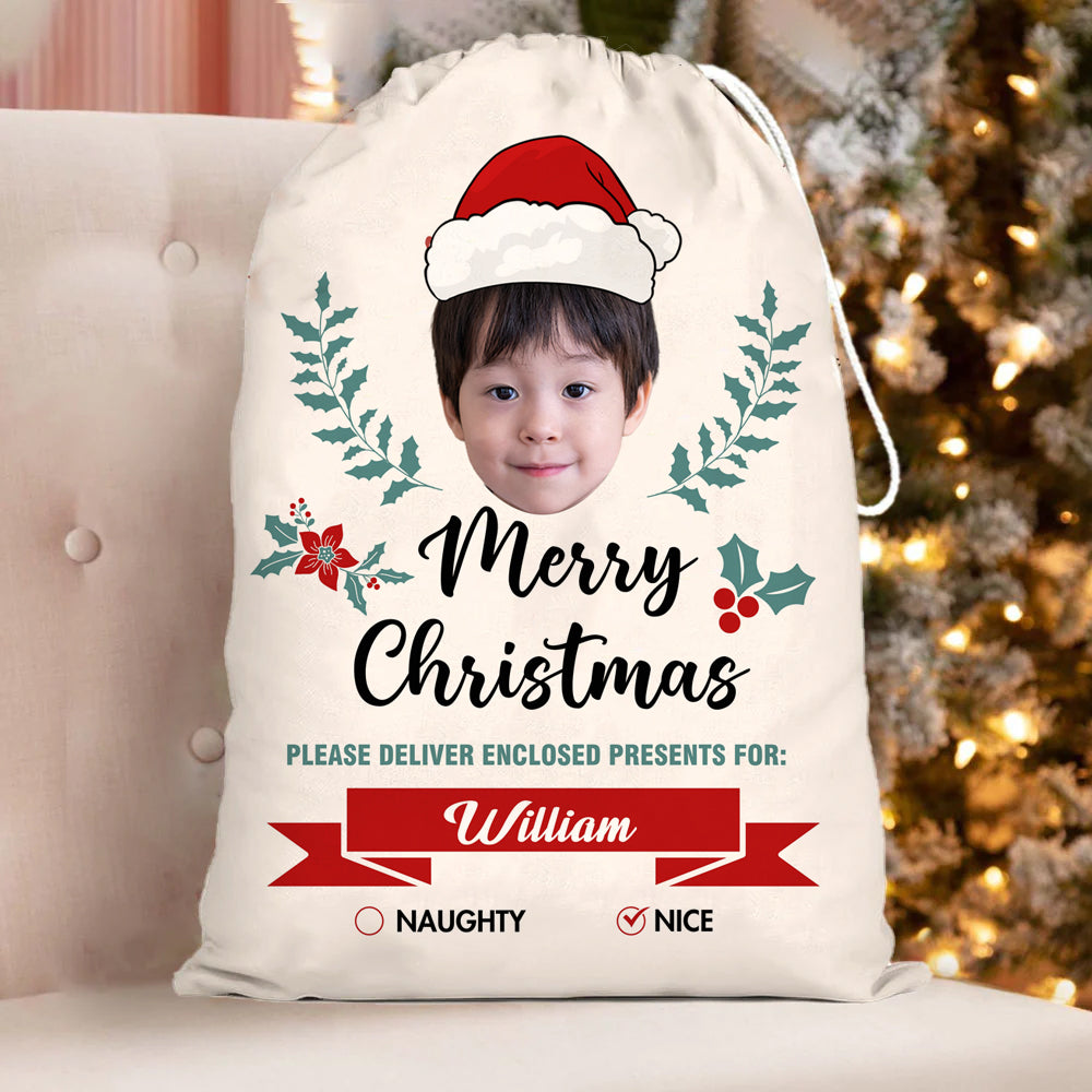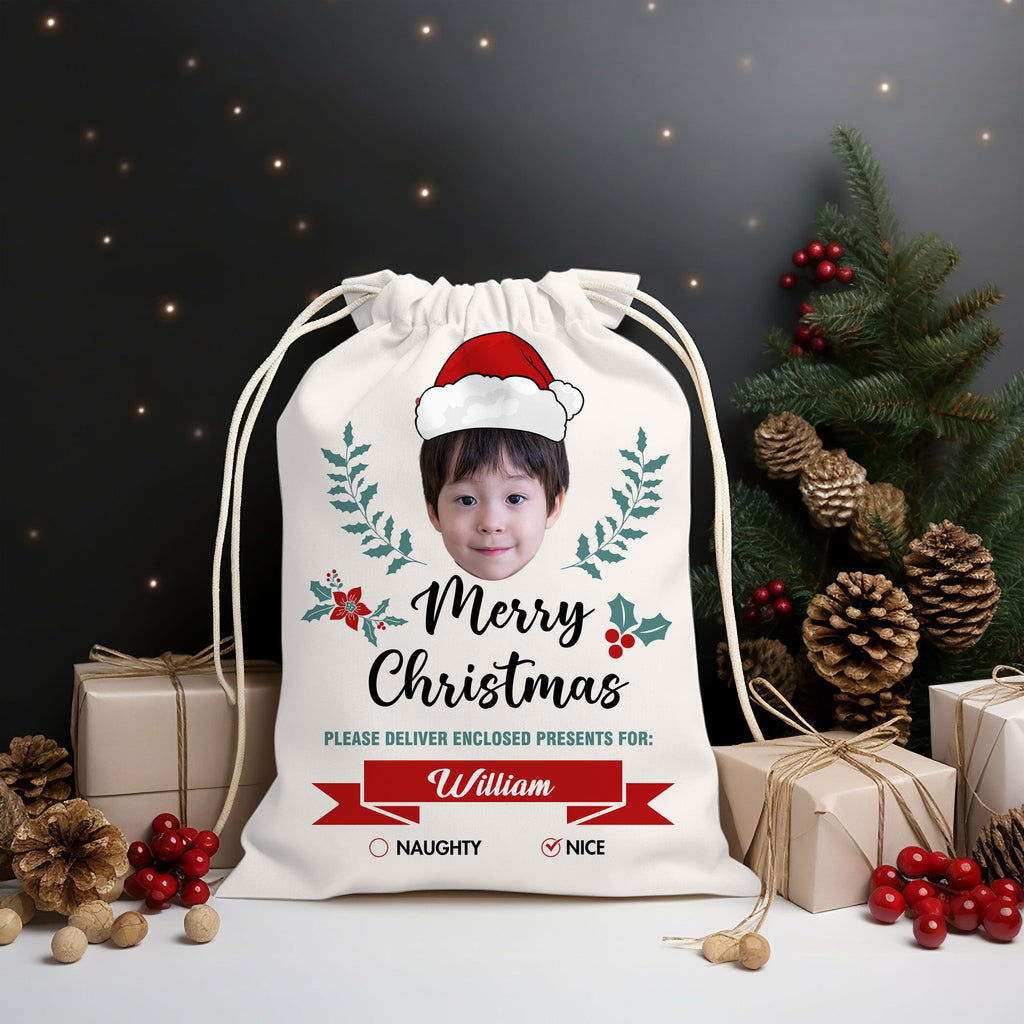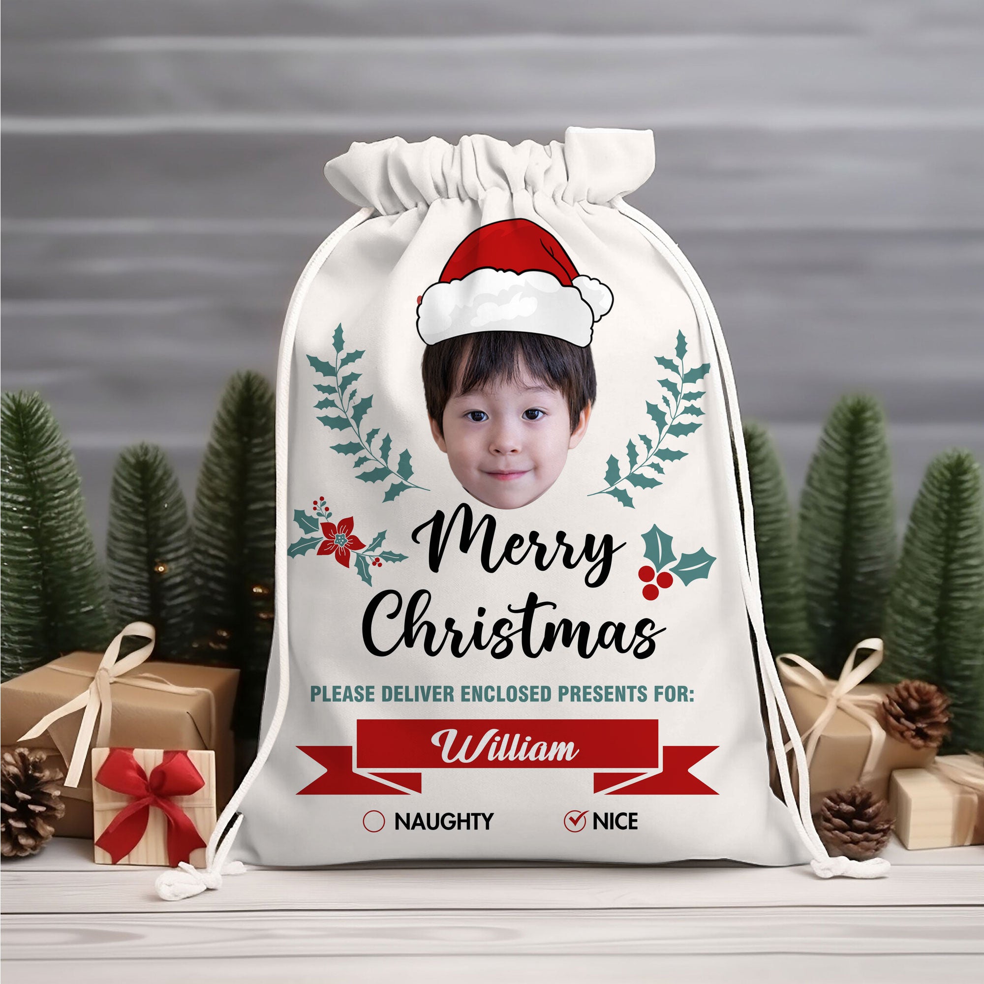 Christmas Kid Face Custom Photo And Name, Personalized String Bag, Christmas Gift