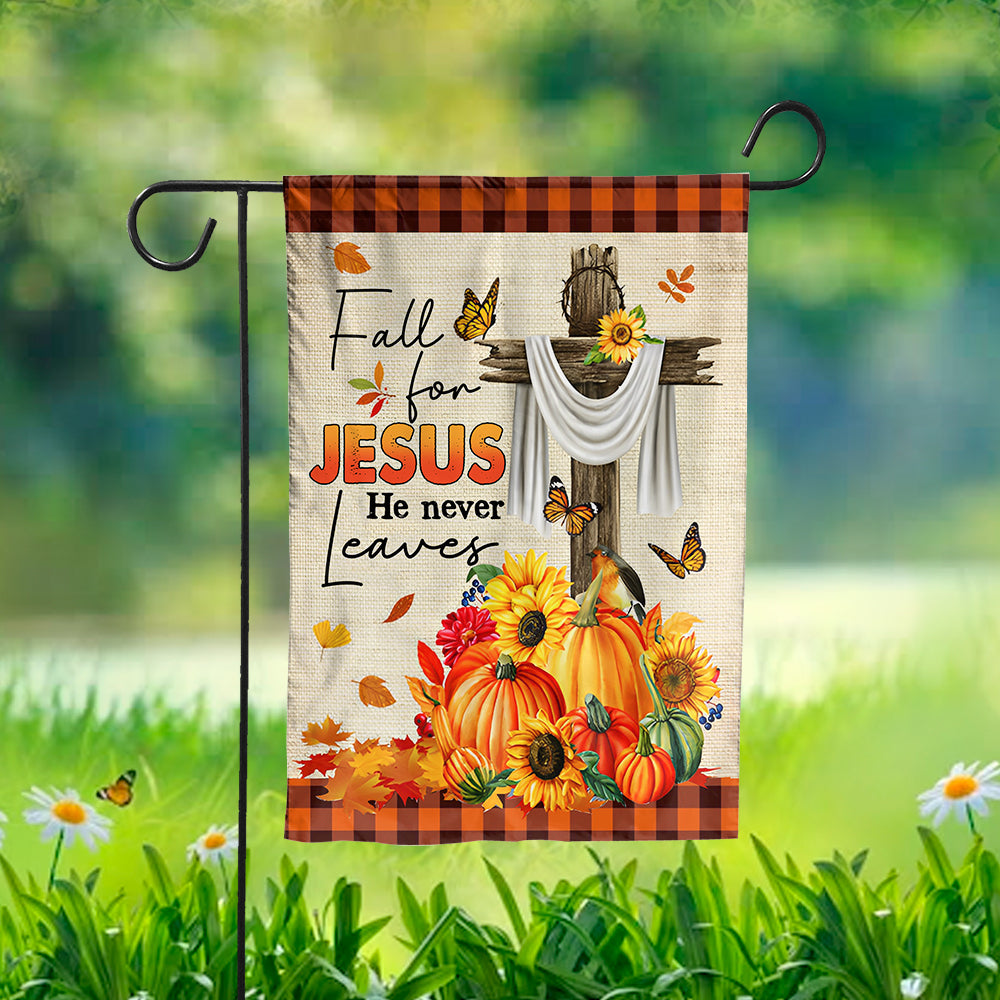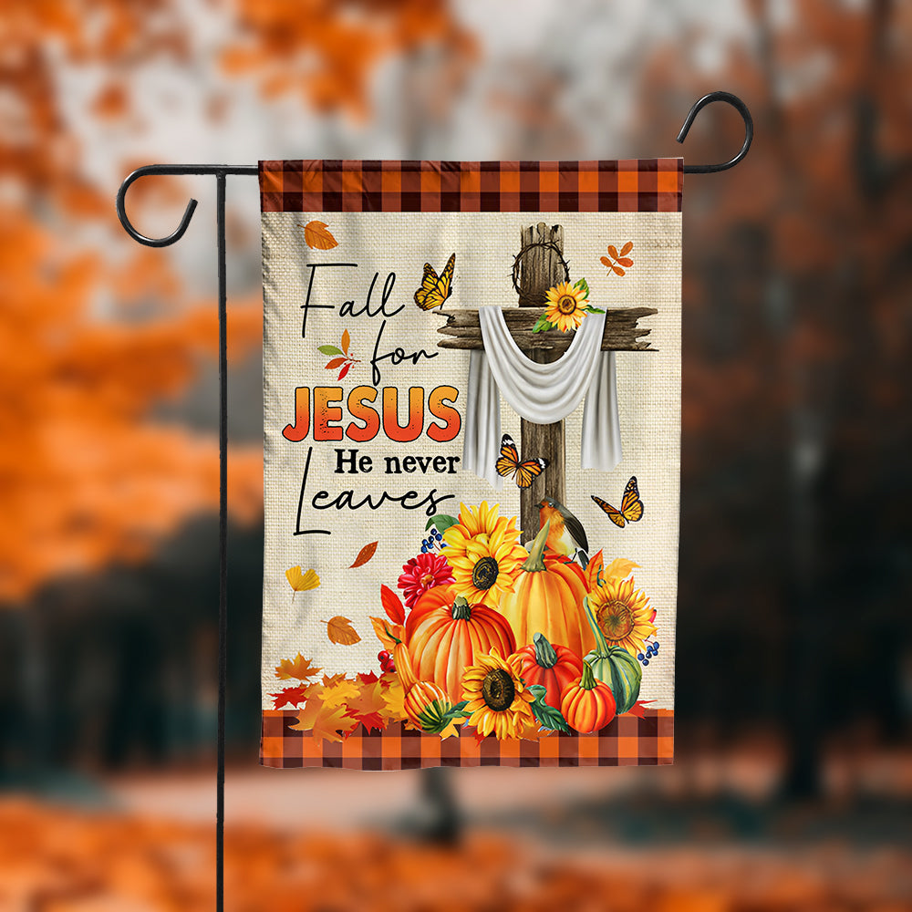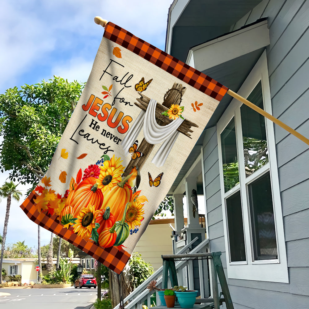 Fall For Jesus - He Never Leaves - Personalized Photo And Name Flag - Thanksgiving Gifts