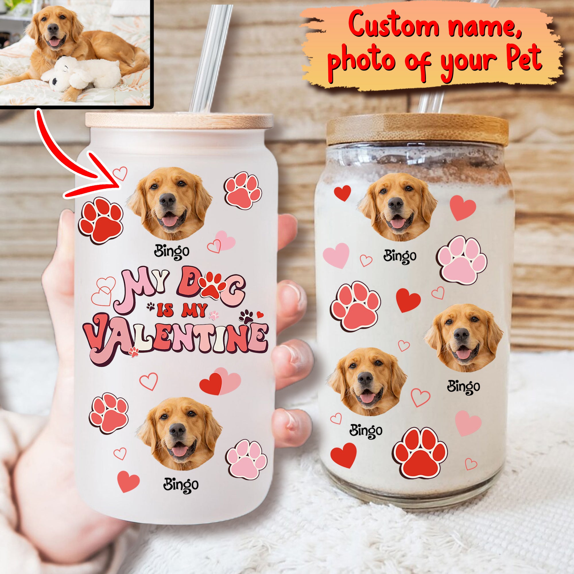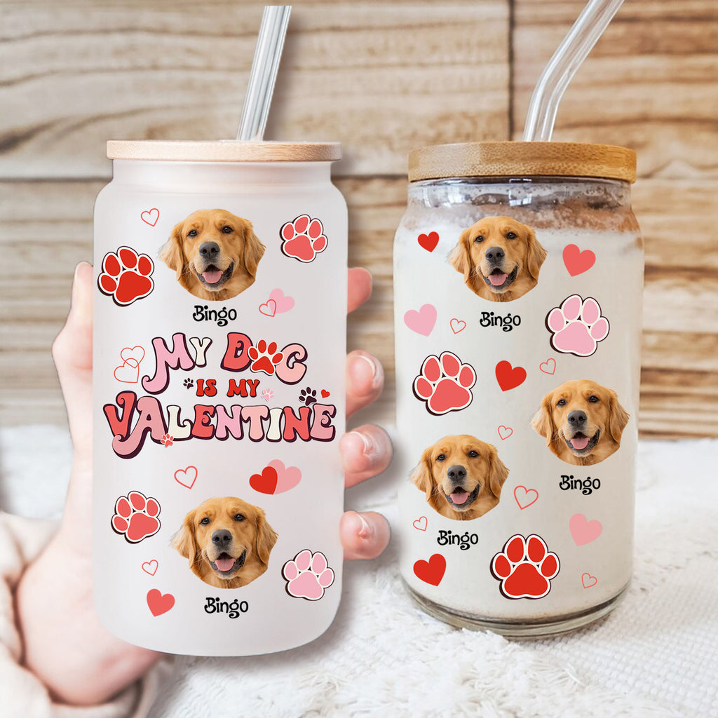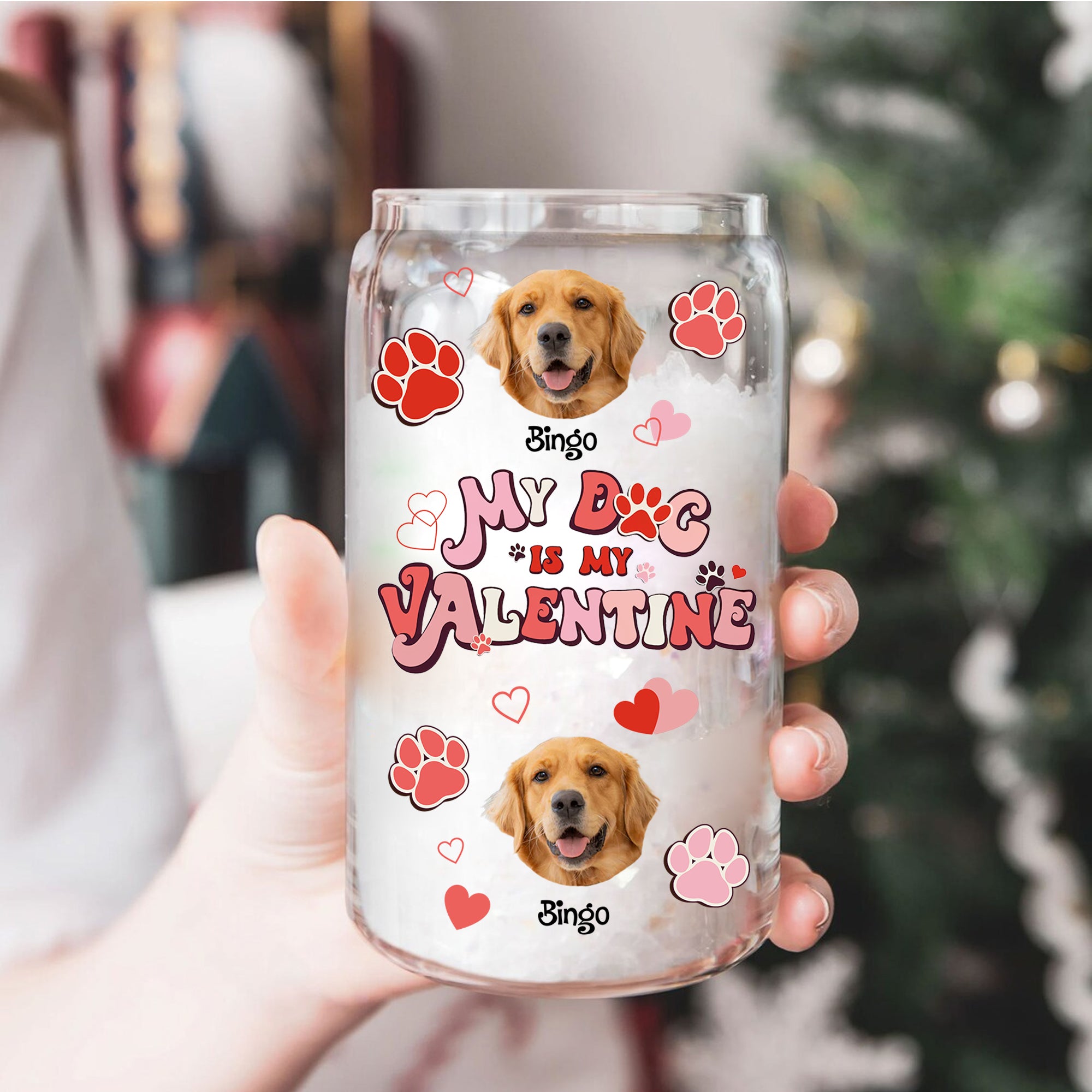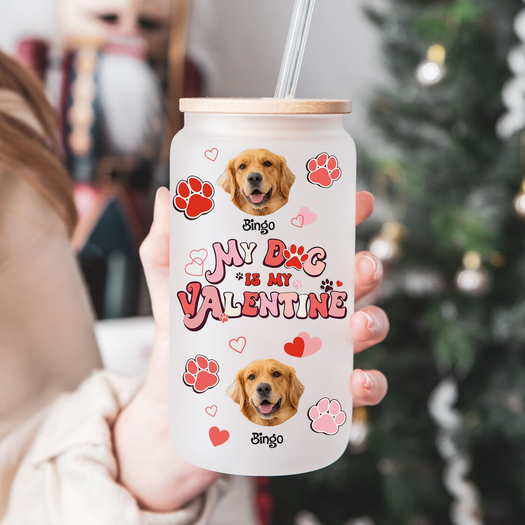 My Dog Is My Valentine - Cutie Puppy - Custom Photo And Name - Personalized Glass Bottle, Frosted Bottle, Gift For Pet Lover