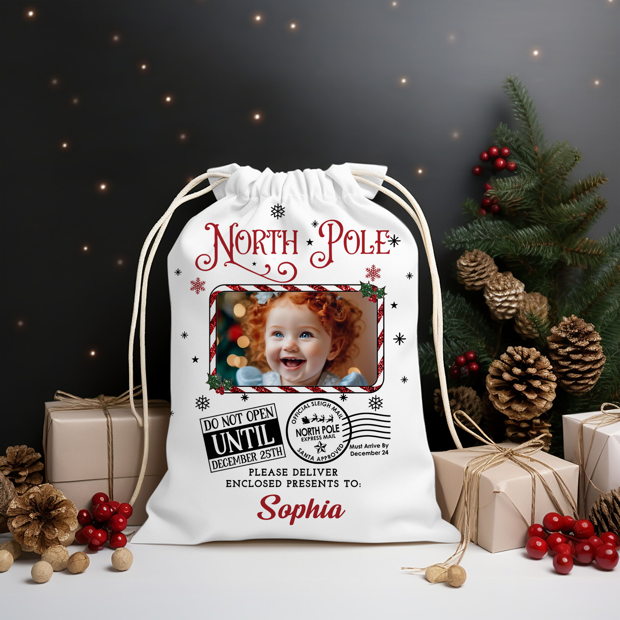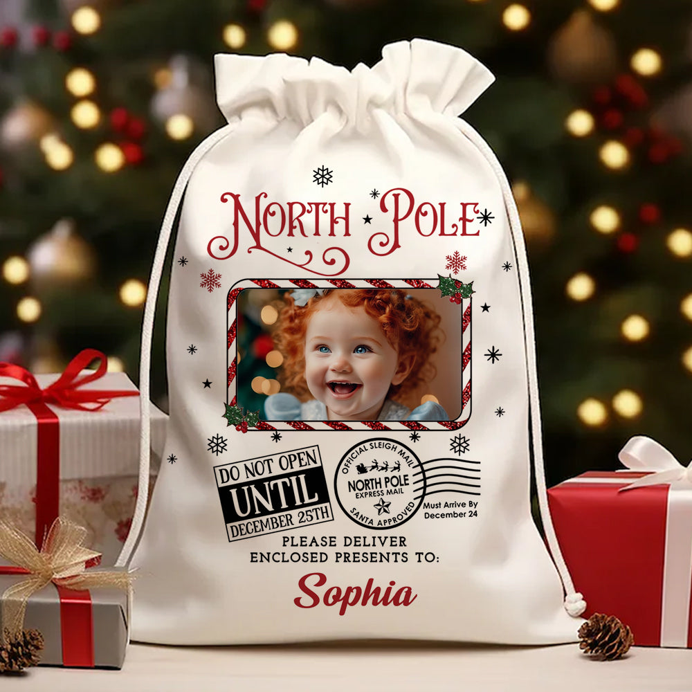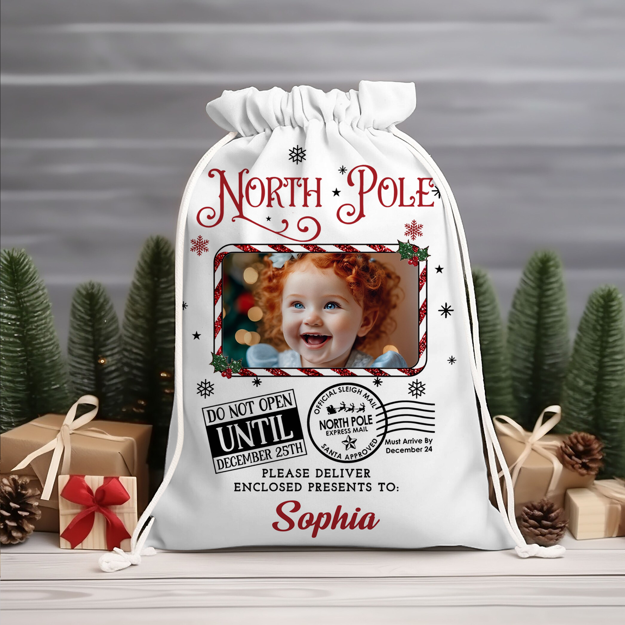 North Pole Delivery For Custom Photo And Name, Personalized String Bag, Christmas Gift