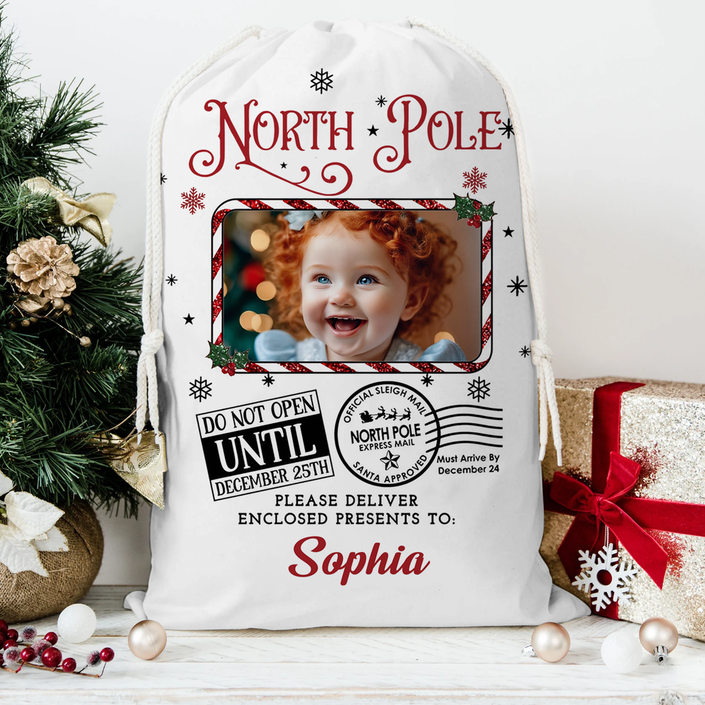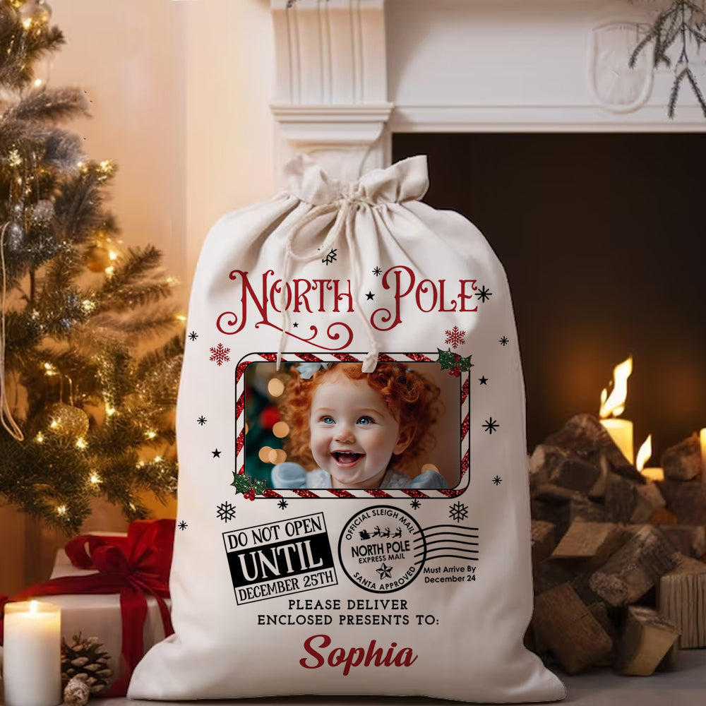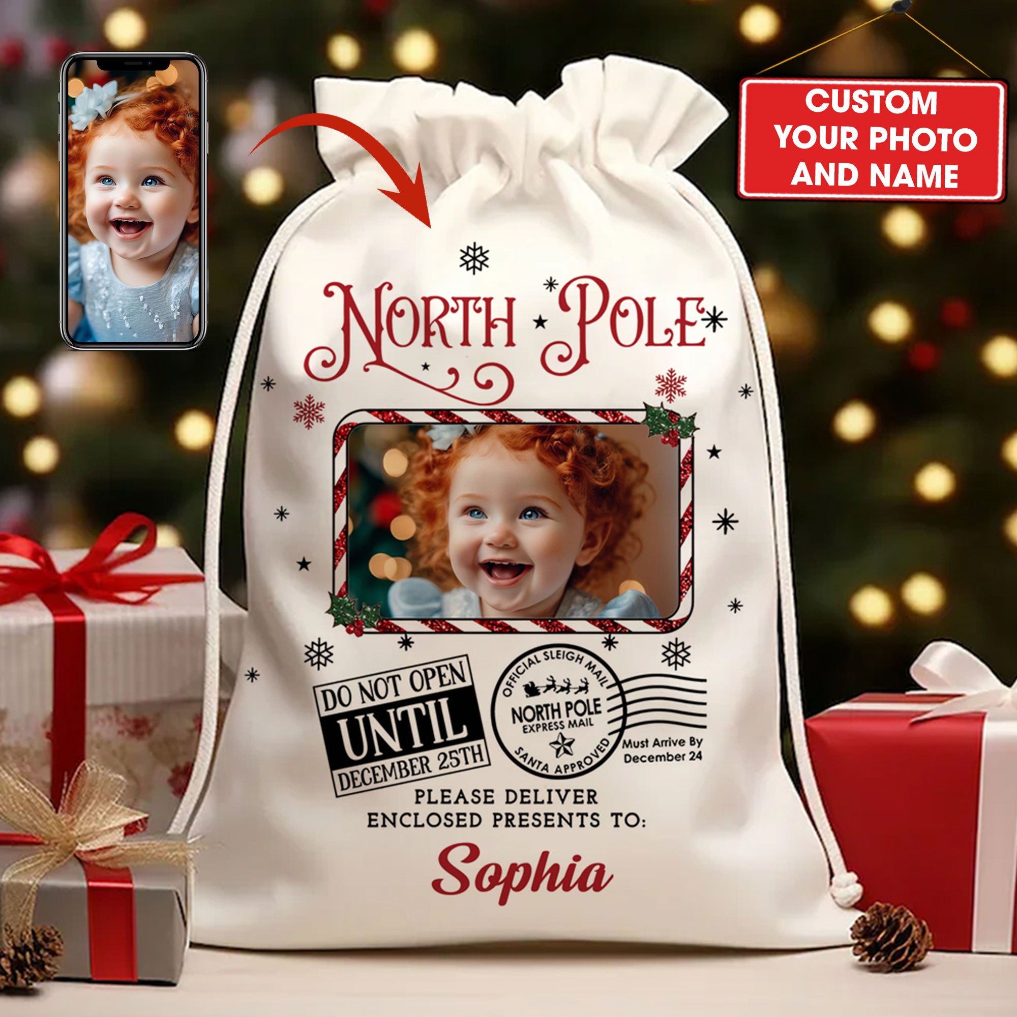 North Pole Delivery For Custom Photo And Name, Personalized String Bag, Christmas Gift