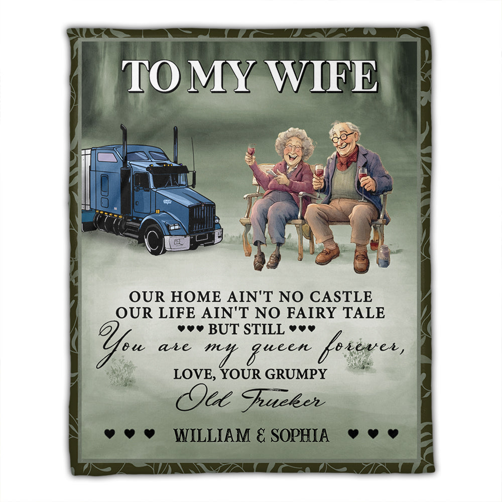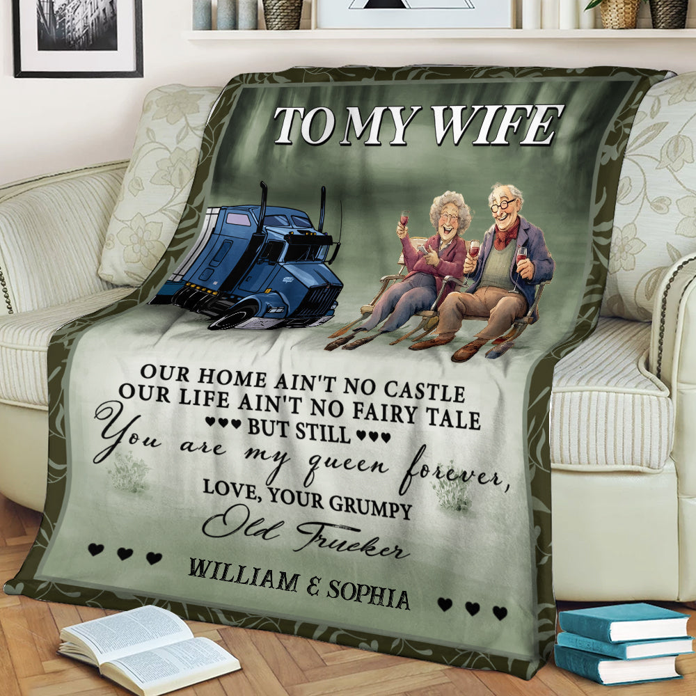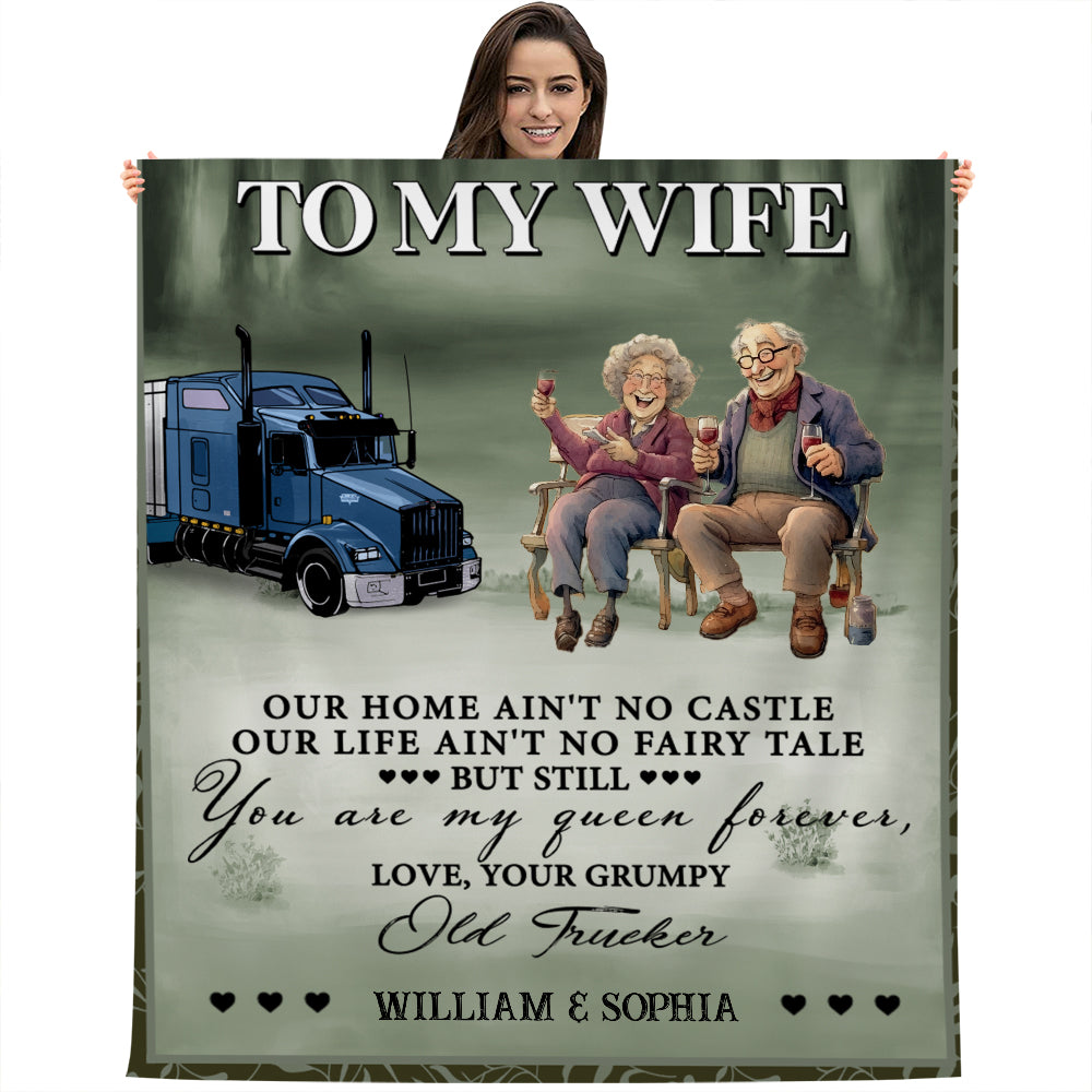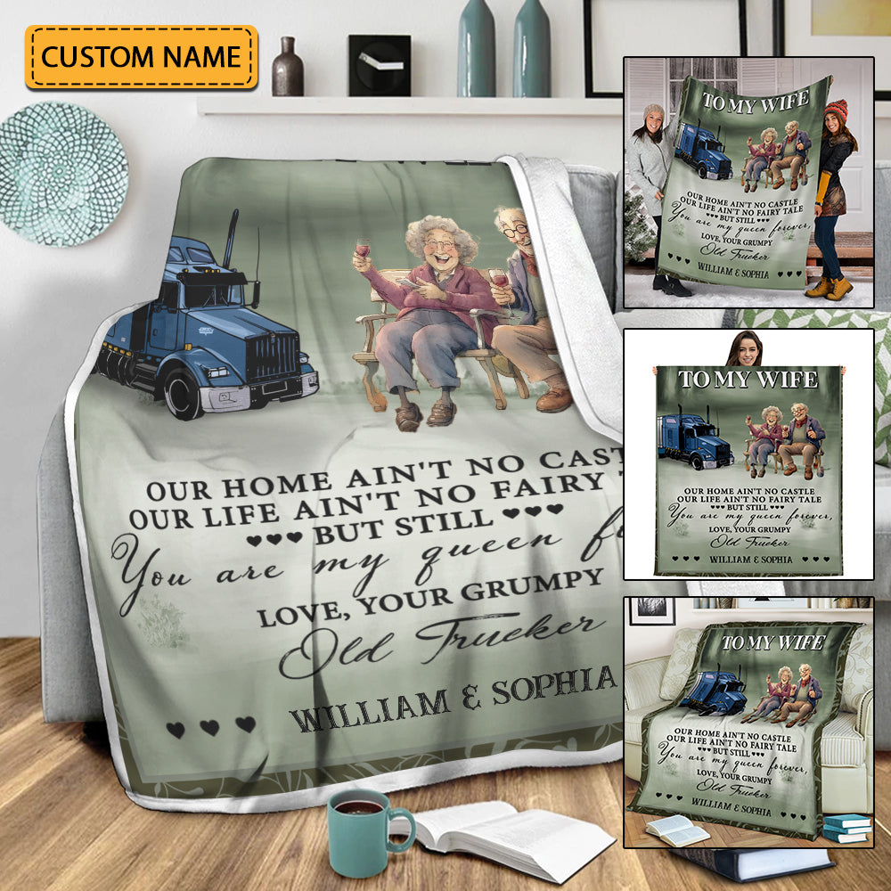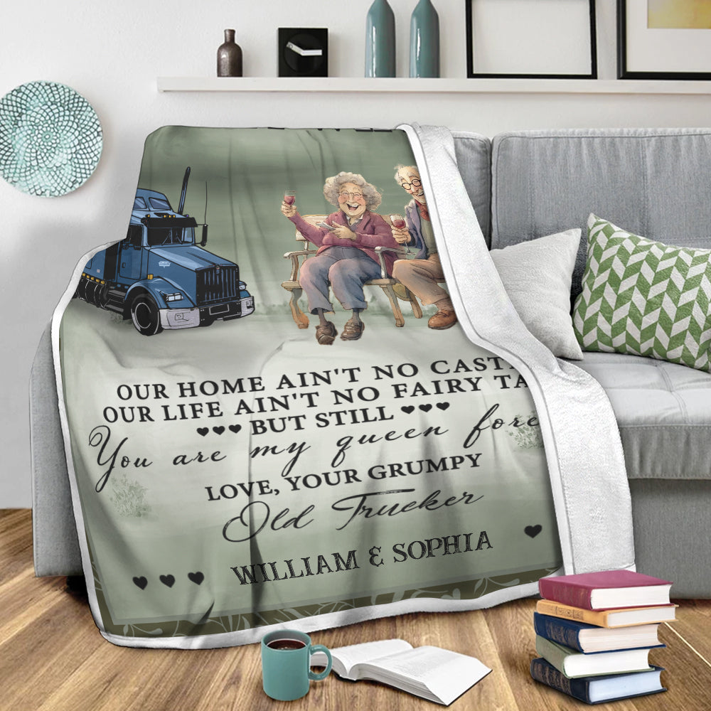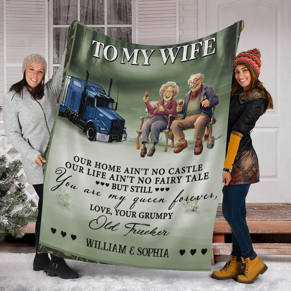 To My Wife, You Are My Queen Forever, Love Your Grumpy Old Trucker - Custom Names - Personalized Fleece Blanket, Gift For Family